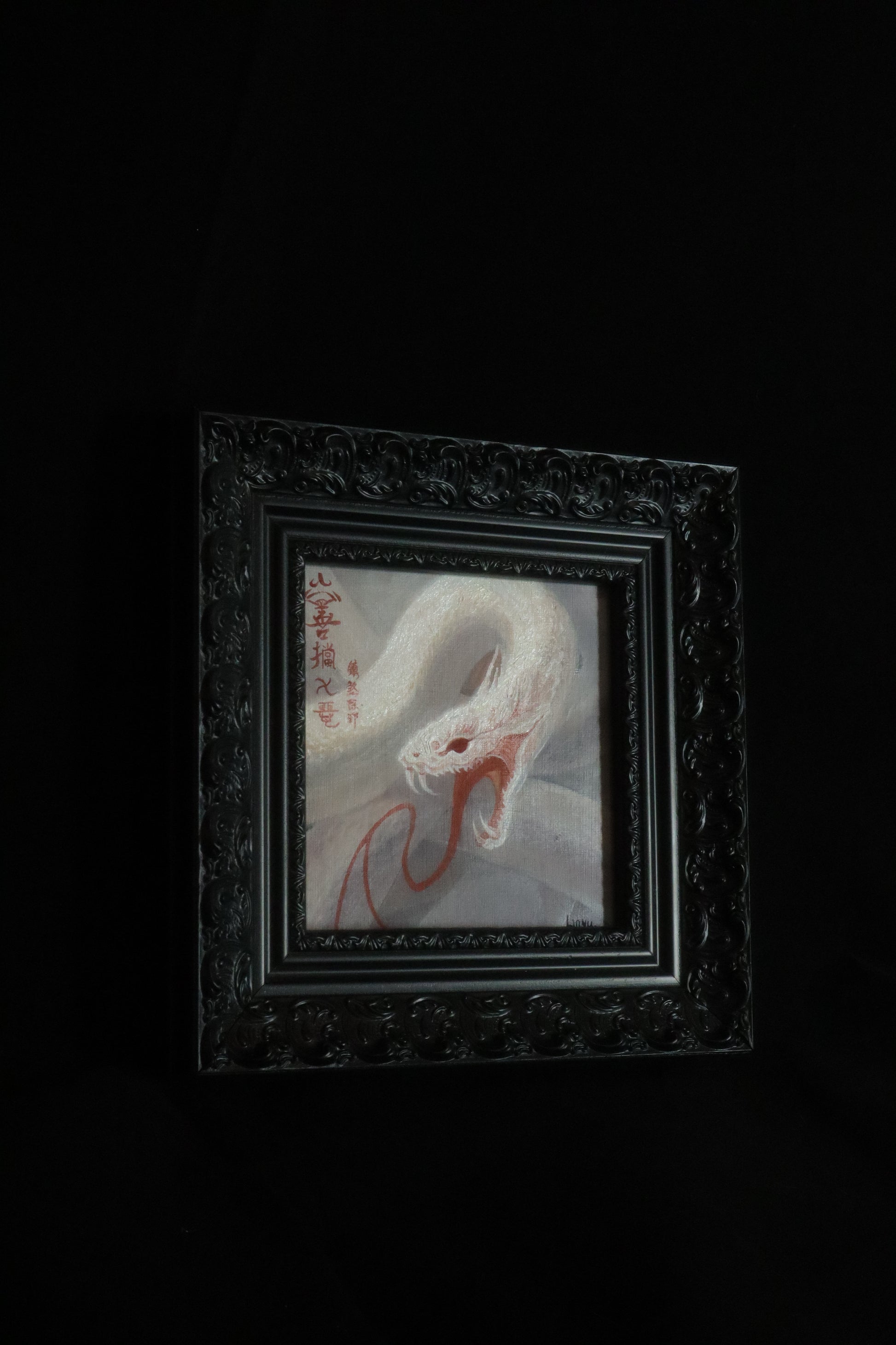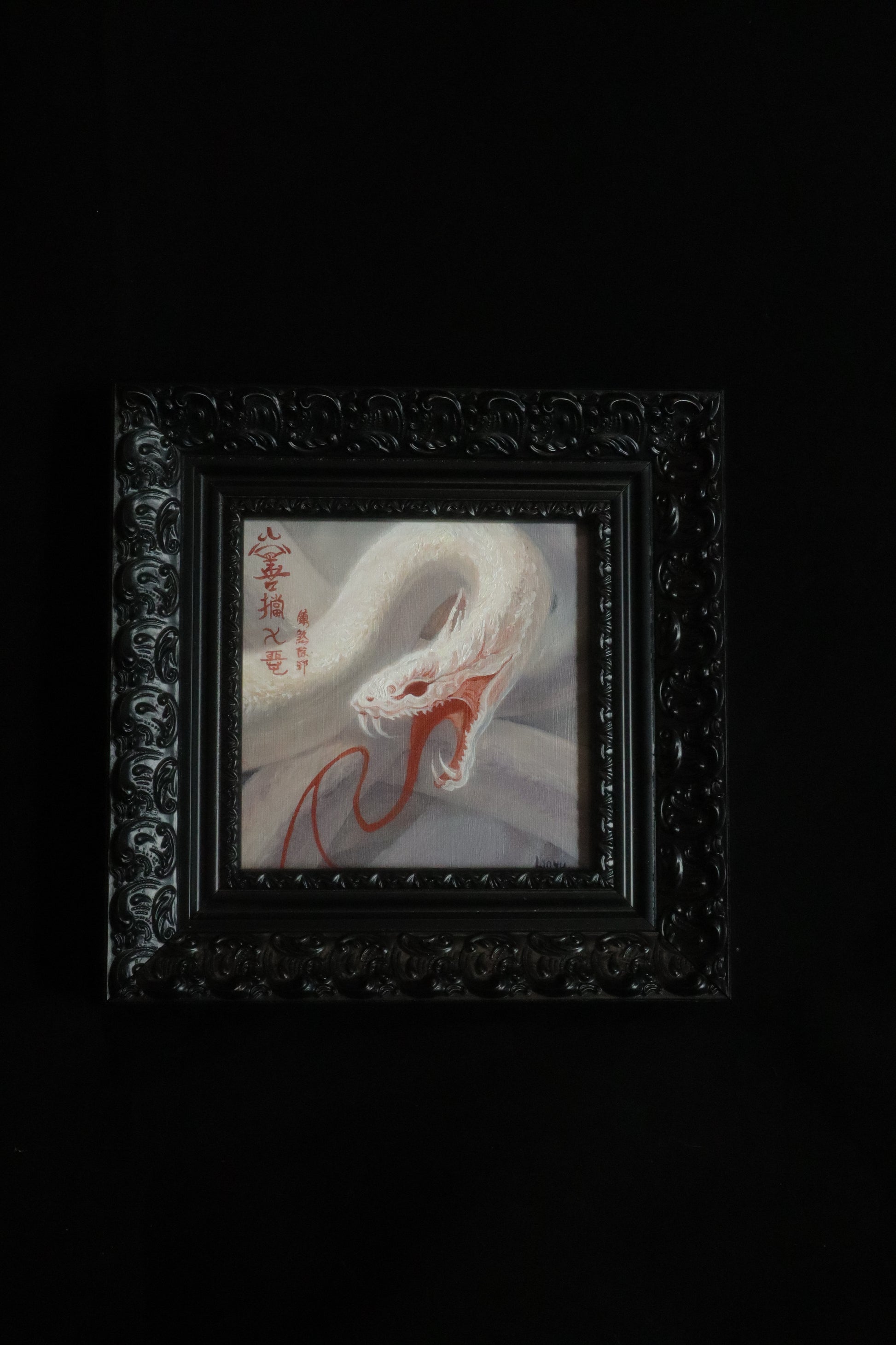 A small yet striking piece, crafted with oil pigments and cinnabar accents.
