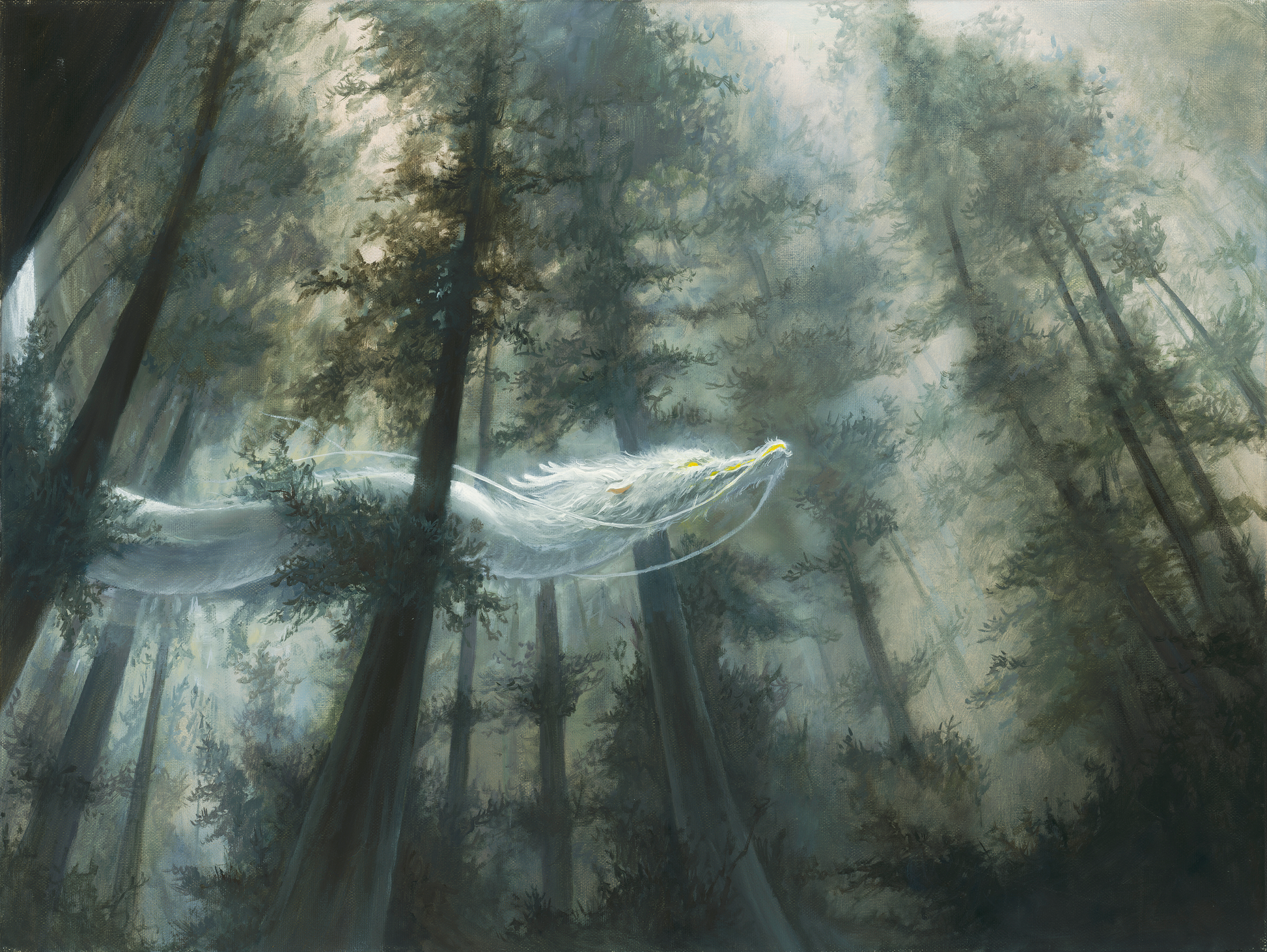 Standing deep in the forest, I look up at a white dragon moving ahead. It doesn’t notice me, and I feel no fear—instead, it’s as if I’ve accidentally wandered into its world. I just watch it quietly, and we share the same space together.