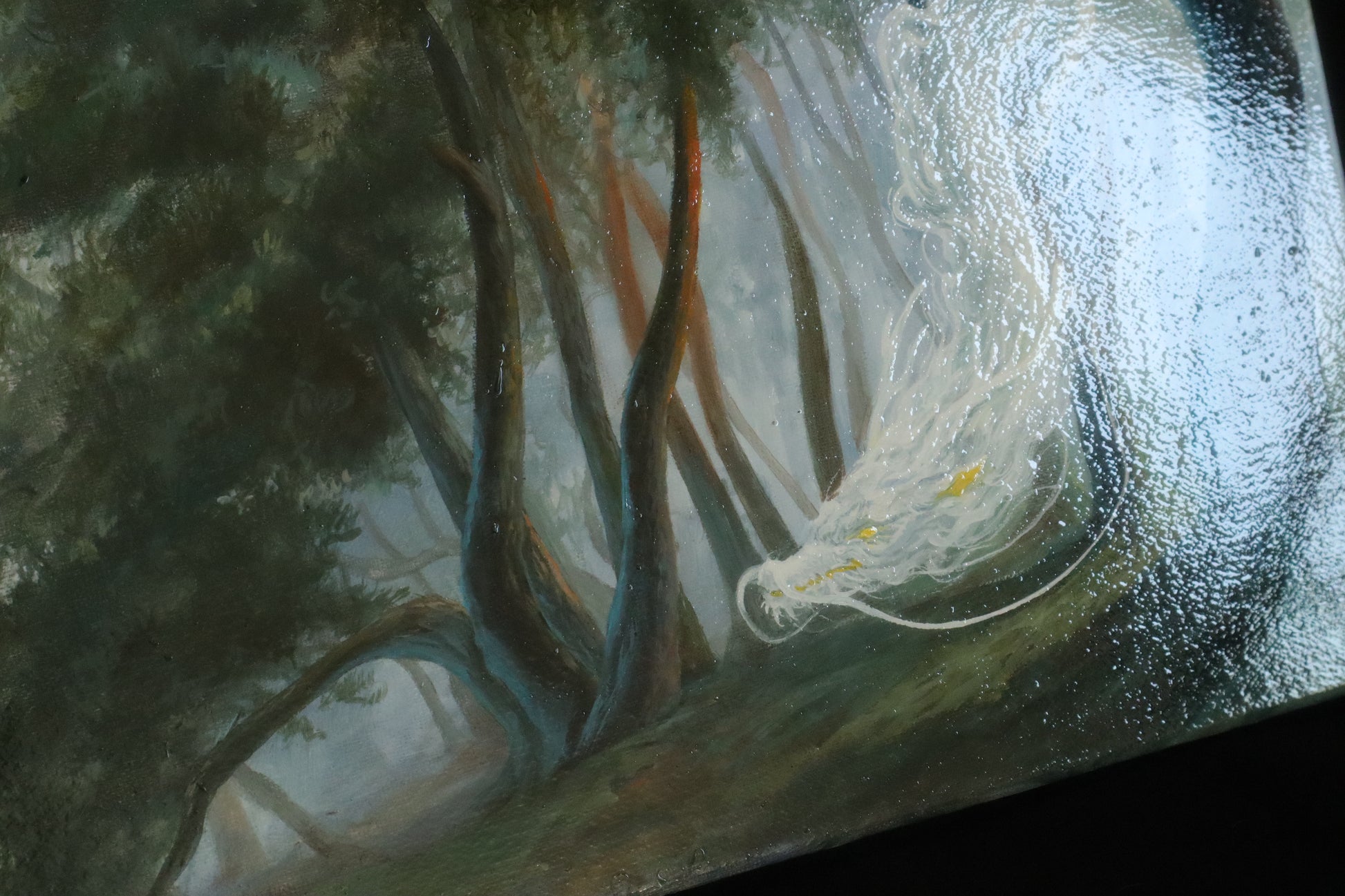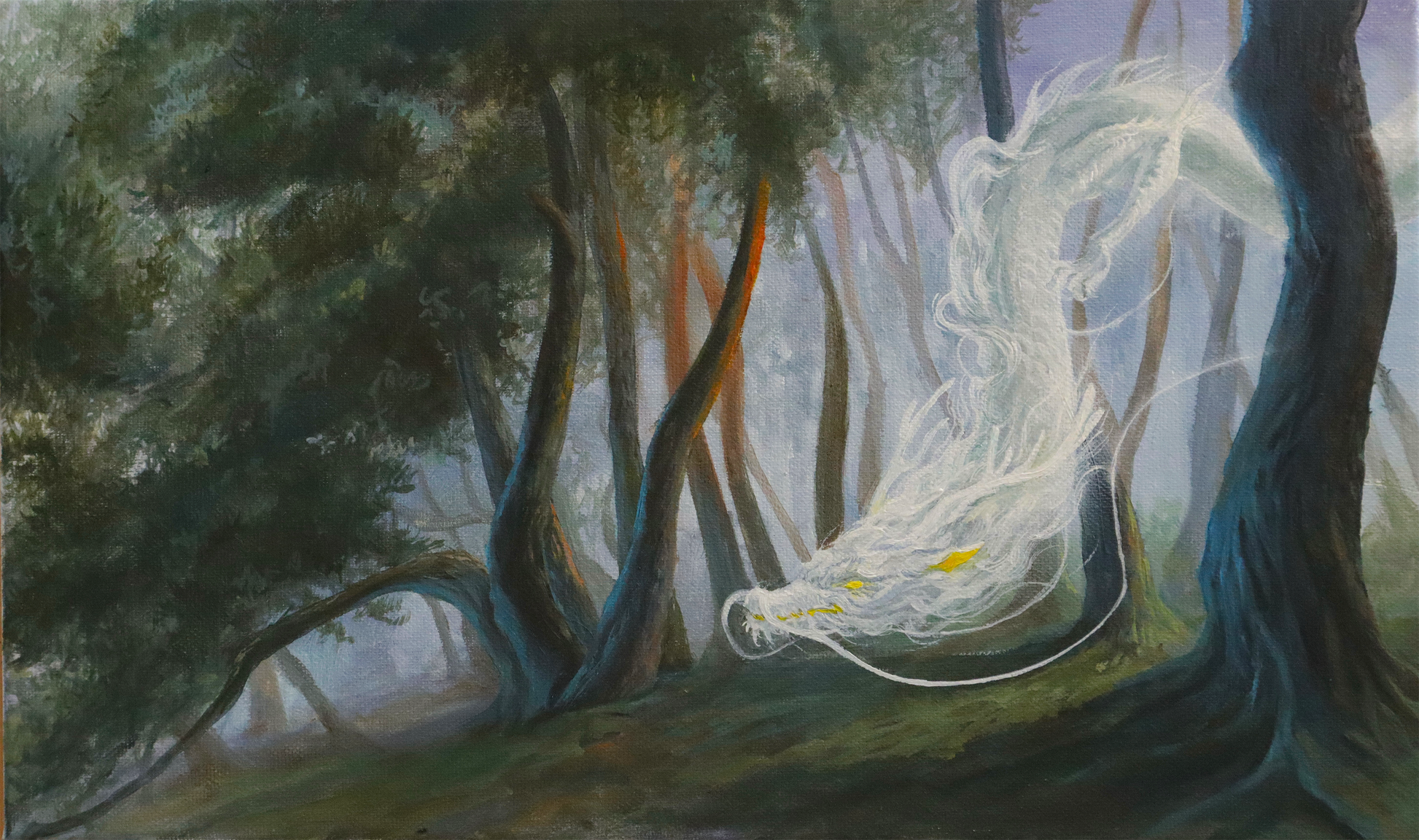 This painting captures the quiet moment after a sunshower—the scent of damp earth still lingering as the evening sun fades. A white dragon glides from the light toward the depths of the forest.