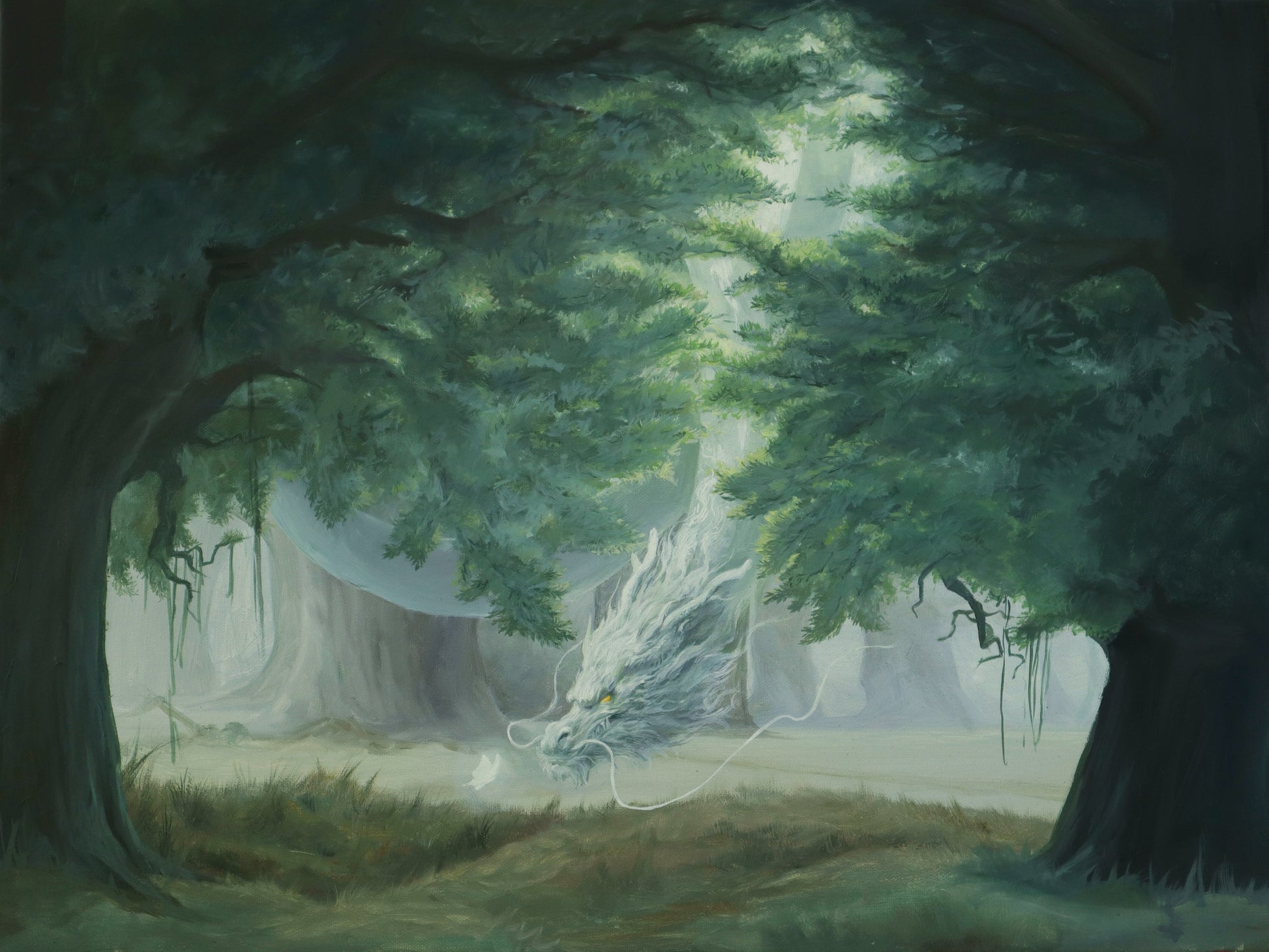 On a sunny noon, a little white dragon plays with butterflies in the forest. They’re joyful and at ease, with no divide between their kinds.